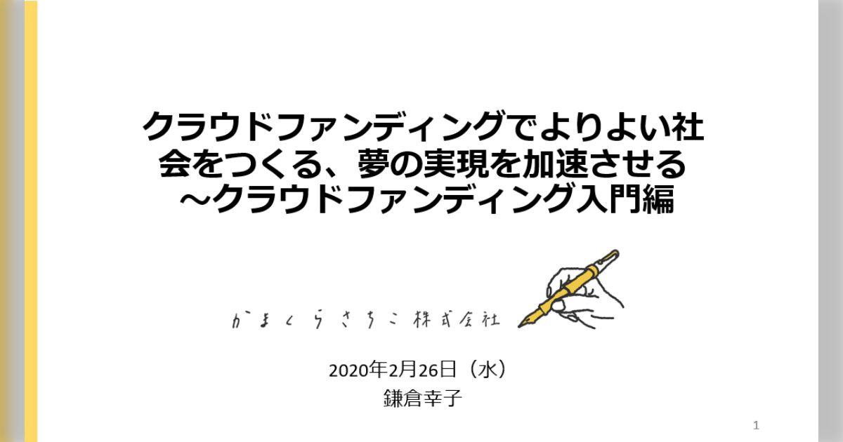 2020年2月26日(水)に渋谷COHSAを会場に開催された「クラウドファンディングでよりよい社会をつくる、夢の実現を加速させる~クラウドファンディング入門編」(主催:一般財団法人22世紀に残すもの)で講師を務めました。
