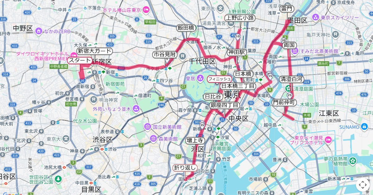 0.00km[新宿区西新宿]スタート・東京都庁1.00km[新宿区西新宿]1.60km[新宿区西新宿]新宿大ガード2.00km[新宿区新宿]3.00km[新宿区新宿]4.00km[新宿区片町]4.87km[新宿区市谷八幡町]市谷見附5.00km[新宿区市谷田町]6.00km[新宿区神楽坂]6.45km[文京区後楽]飯田橋7.00km[文京区後楽]8.00km[千代田区神田神保町]9.00km[千代田区神田淡路町]10.00km[千代田区外神田]10.54km[台東区上野]上野広小路11.00km[千代田区外神田]12.00km[千代田区神田須田町]12.15km[千代田区内神田]神田駅13.00km[中央区日本橋室町]13.19km[中央区日本橋室町]日本橋14.00km[中央区日本橋茅場町]15.00km[中央区日本橋浜町]16.00km[中央区日本橋横山町]17.00km[台東区蔵前]18.00km[台東区雷門]18.16km[台東区浅草]雷門19.00km[台東区蔵前]20.00km[墨田区横網]20.69km[墨田区亀沢]両国21.00km[墨田区緑一丁目]22.00km[江東区常盤]22.25km[江東区白河]清澄白河23.00km[江東区深川]23.39km[江東区門前仲町]門前仲町24.00km[江東区富岡]24.42km[江東区門前仲町]中間点25.00km[江東区深川]26.00km[江東区森下]27.00km[墨田区緑一丁目]28.00km[台東区蔵前]29.00km[中央区東日本橋]30.00km[中央区日本橋浜町]31.00km[中央区日本橋茅場町]32.00km[中央区日本橋]32.16km[中央区京橋]日本橋三丁目33.00km[中央区銀座]33.23km[中央区銀座]銀座四丁目34.00km[千代田区有楽町]35.00km[港区新橋]36.00km[港区芝公園]37.00km[港区芝四丁目]37.46km[港区芝五丁目]折り返し37.84km[港区芝五丁目]芝五丁目38.00km[港区芝四丁目]38.87km[港区芝公園]増上寺39.00km[港区芝公園]40.00km[港区新橋]41.00km[千代田区日比谷公園]41.06km[千代田区日比谷公園]日比谷42.00km[千代田区丸の内]42.195km[千代田区丸の内]フィニッシュ・東京駅前https://gcy.jp/mrt/tokyom.html