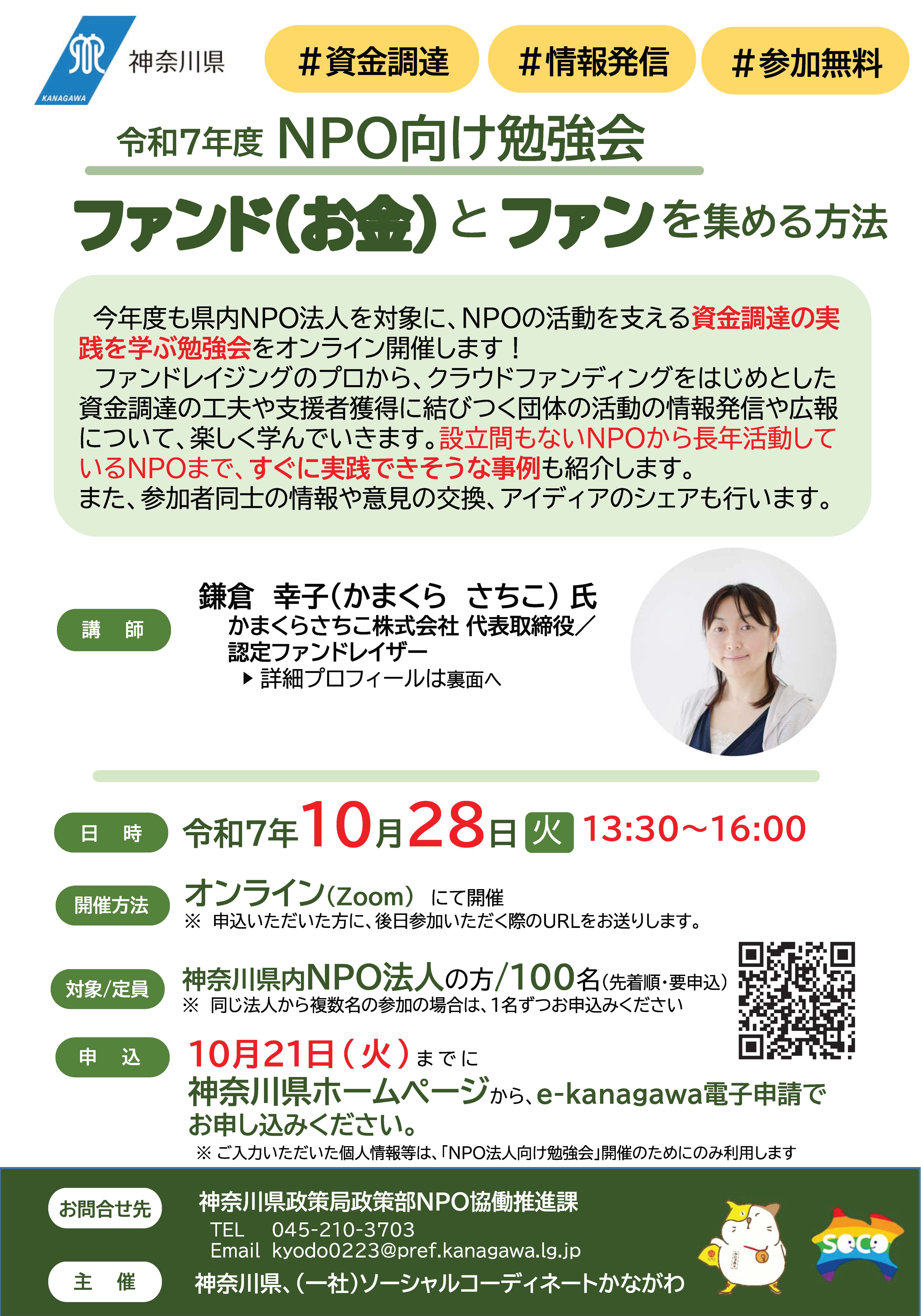 神奈川県内に所在するNPO法人向けに「ファンド(お金)とファンを集める方法」と題したセミナーの講師を務めます。